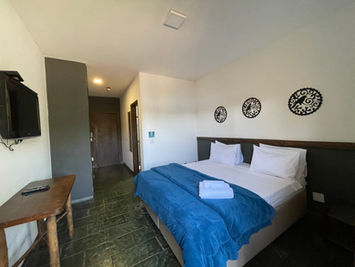 Quarto com cama de casal ou duas camas de solteiro, ar-Condicionado, TV a cabo, frigobar, chaleira elétrica, internet WI-FI e sacada com vista para a Lagoa da Conceição.